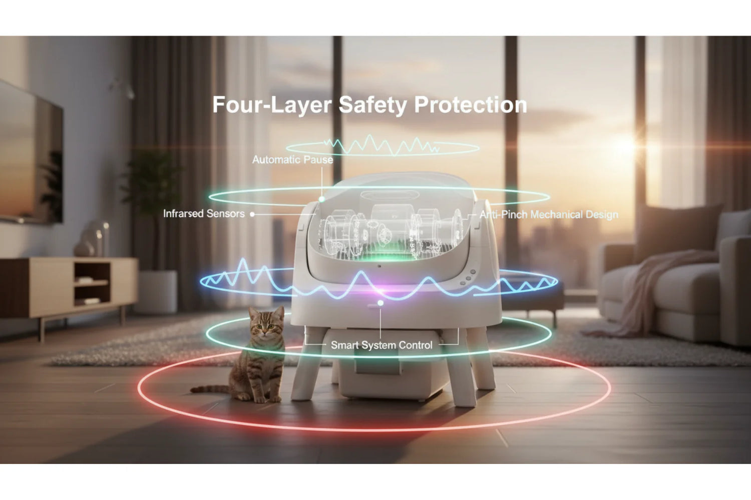 Infrared sensors, anti-pinch design, auto-pause, and smart diagnostics — your cat is safe every second.